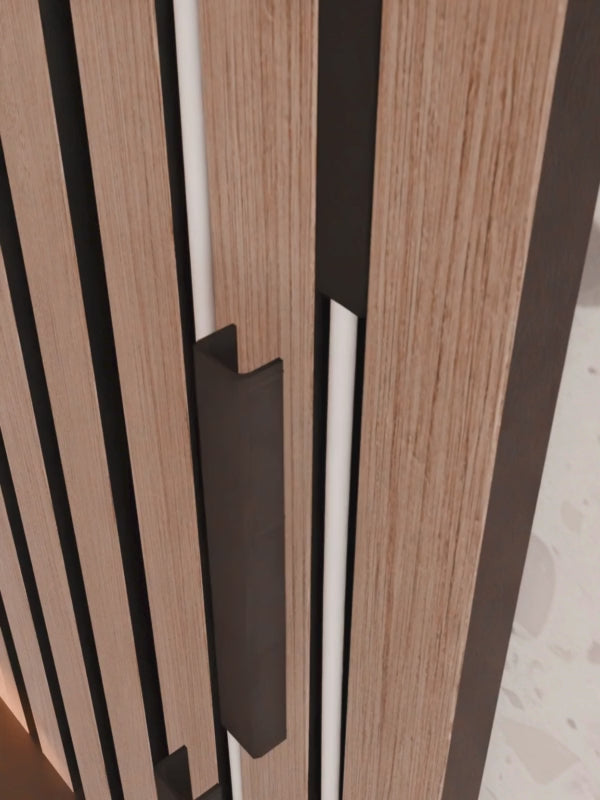 Es verbirgt Kabel für Lampen, Fernseher und Lautsprecher elegant zwischen den Holzlatten.